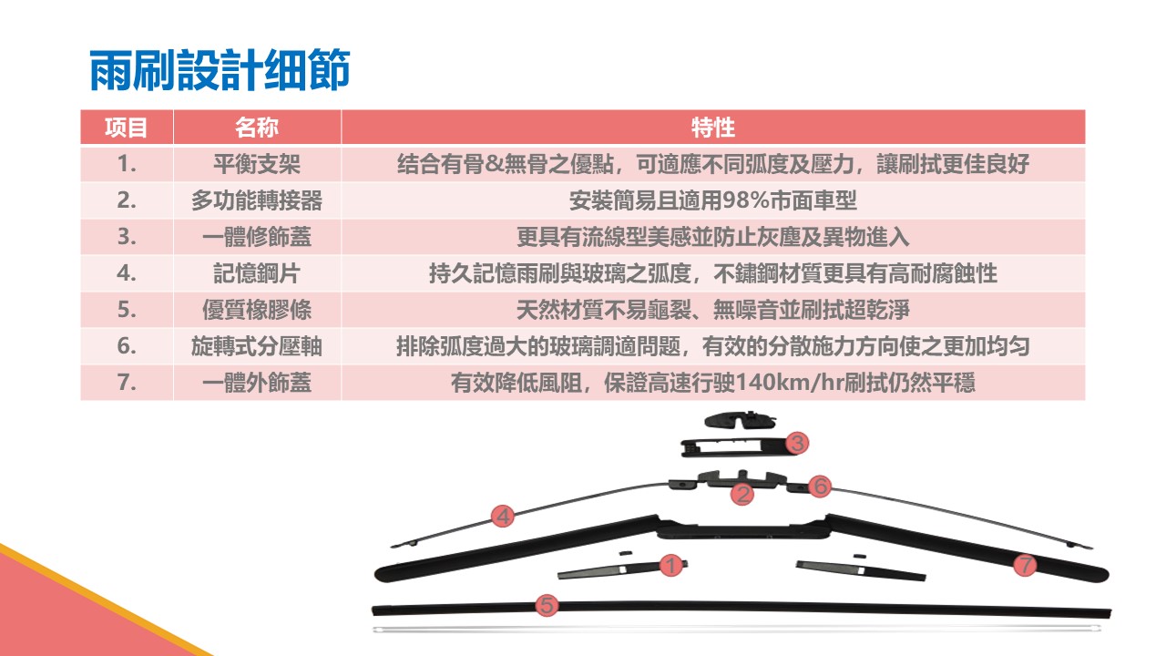持久記憶雨刷與玻璃之弧度,不鏽鋼材質更具有高耐腐蝕性